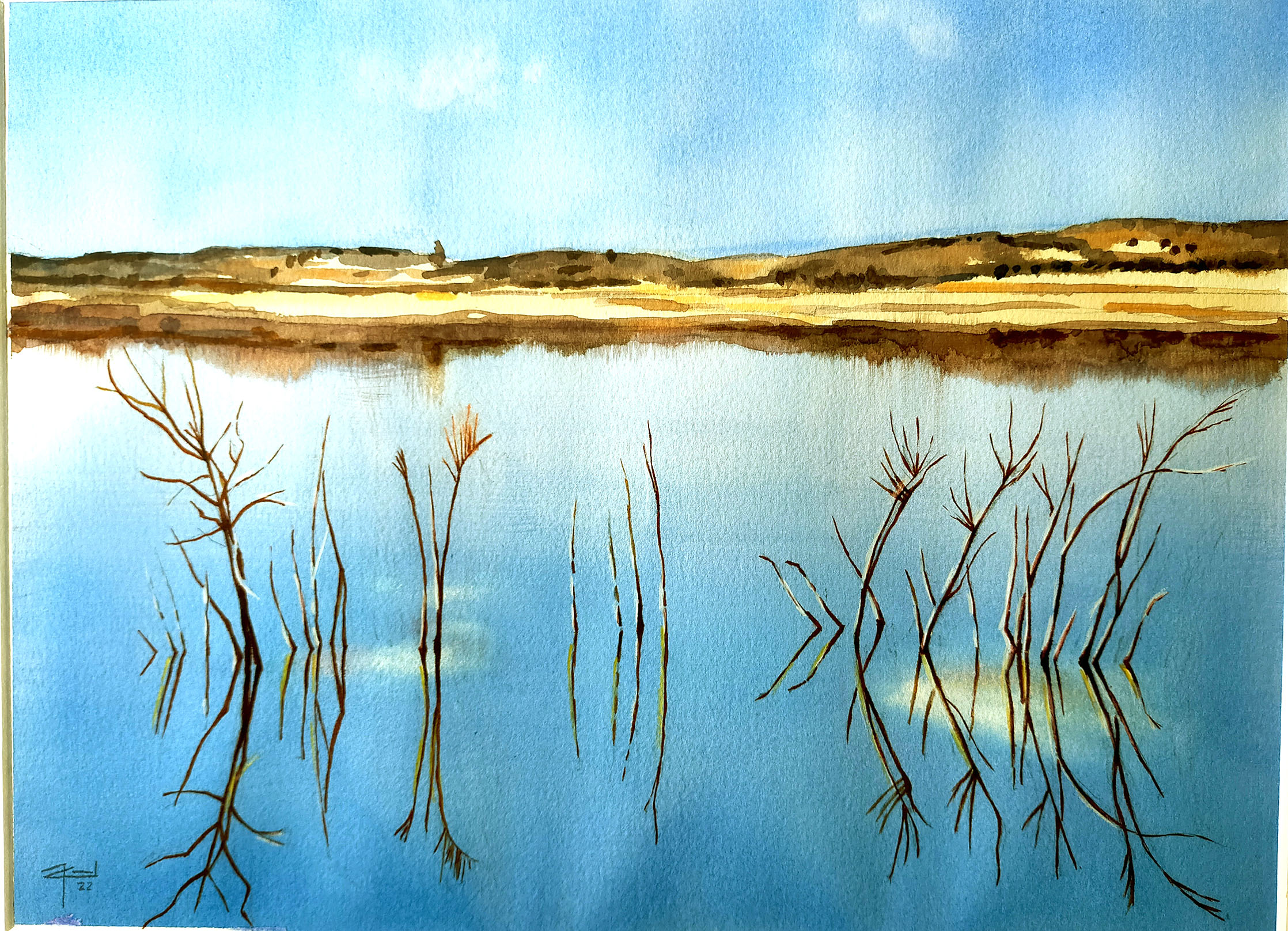 En el trayecto entre Madrid y El Campello por la Autovía de Alicante se pasa cerca de un pueblo llamado Pétrola, donde se encuentran unas lagunas saladas muy interesantes desde el punto de vista hidrológico y ornitológico. Esta acuarela pretende reflejar el inhóspito medio acuático.
